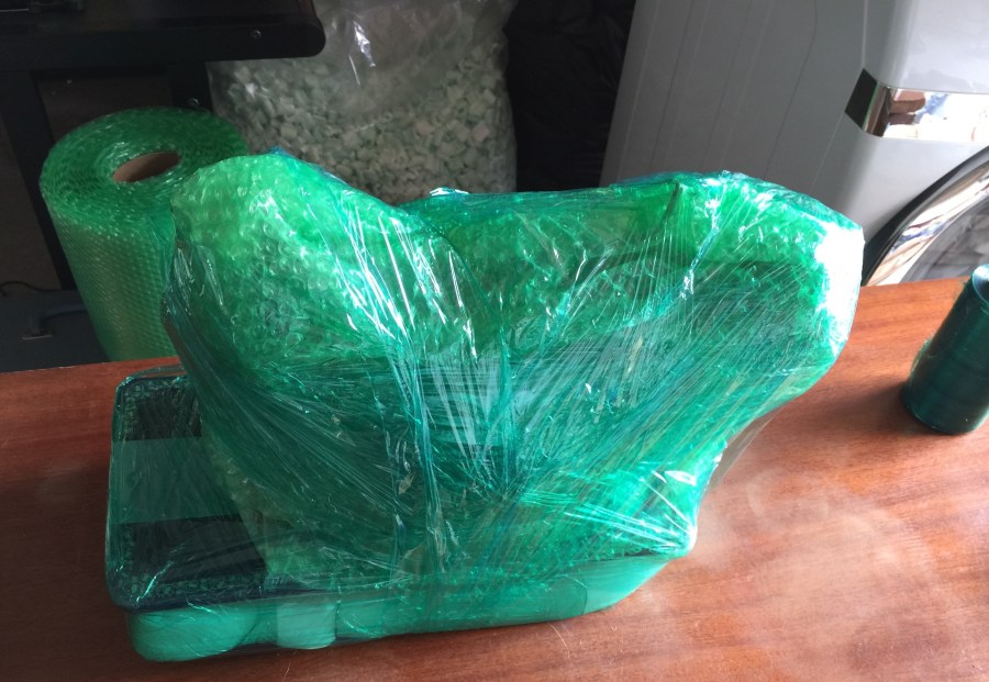 1. First I use bubble warp and shrink wrap to secure anything that moves to the deck of the sewing machine.
